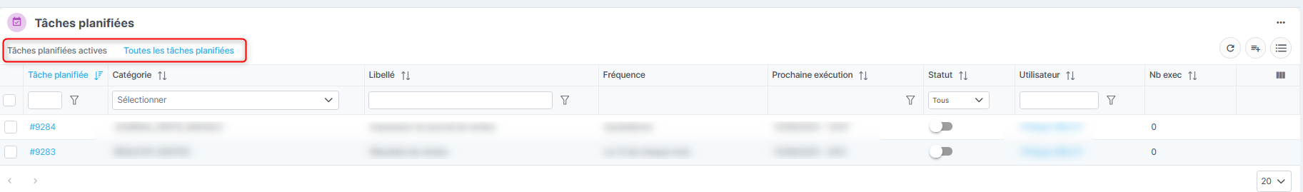 - Tâches planifiées : Passage du tableau en "vue": (Tâches actives ou toutes les tâches)