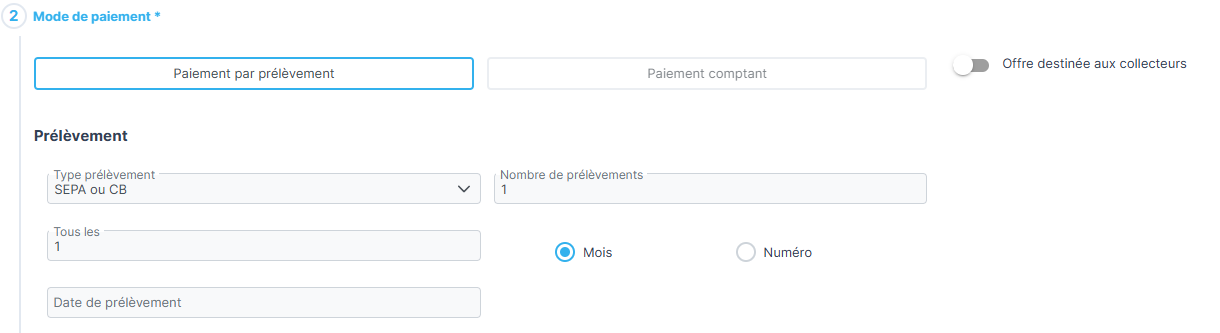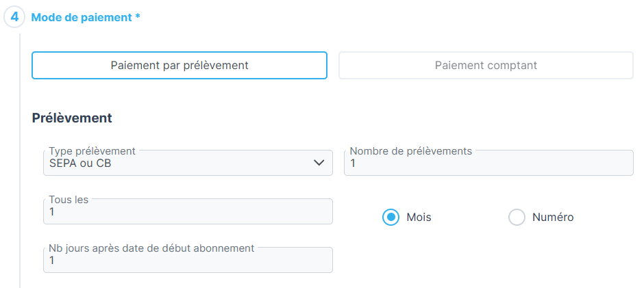 A noter : pour les abonnement de type "Durée Libre" il est possible changer de mode de paiement de Prélèvement à Paiement comptant avec le bouton