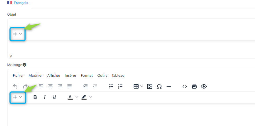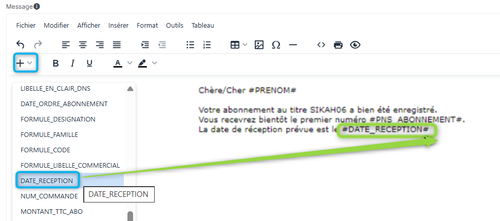 Plusieurs champs de fusion sont disponibles par les + pour être insérés dans l'objet du mail et le texte du mail. Ils permettent d'indiquer notamment le premier numéro à servir, la date de réception du premier numéro etc ...