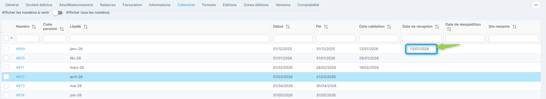 Ce champ de fusion #DATE_RECEPTION# ne sera renseigné que si le calendrier du titre contient cette information pour le premier numéro à servir.