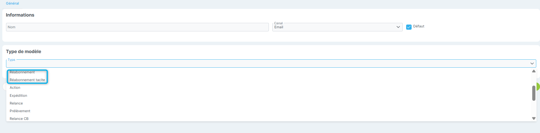 Dans le modèle pour le type, vous pouvez choisir entre Réabonnement et Réabonnement tacite