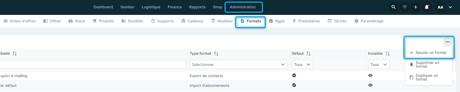 Donnez un nom au format puis sélectionnez le type 'Import d'abonnements'.