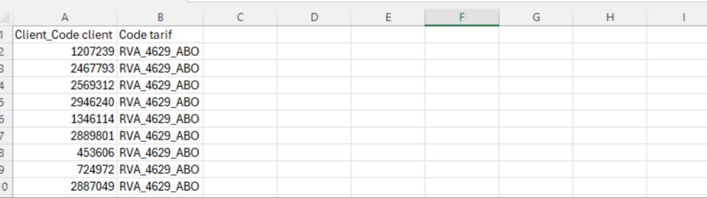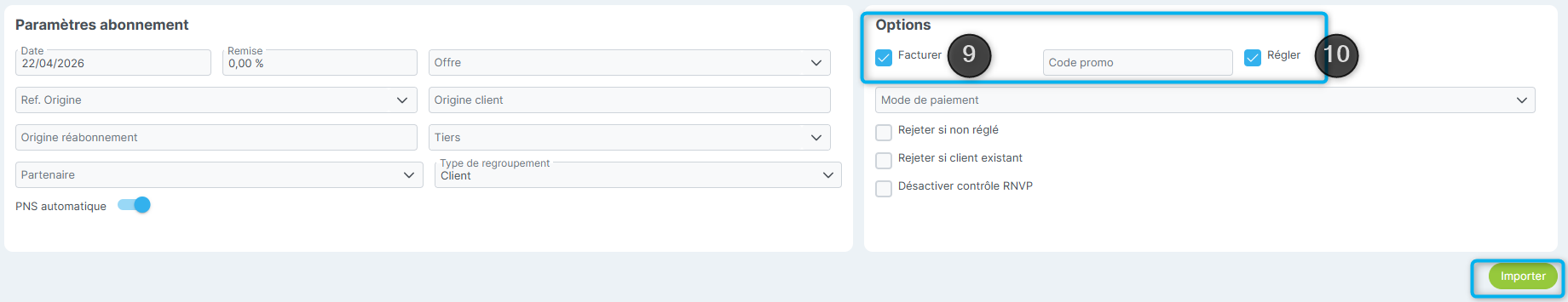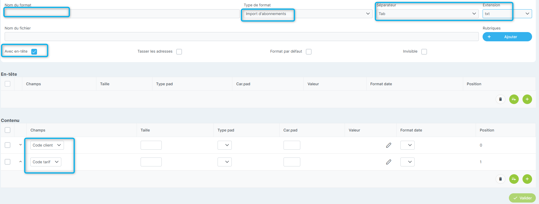 Enregistrer le fichier en format *.txt (avec séparateur TAB) puis l’importer via l'import d'abonnement avec le format précédemment créé.