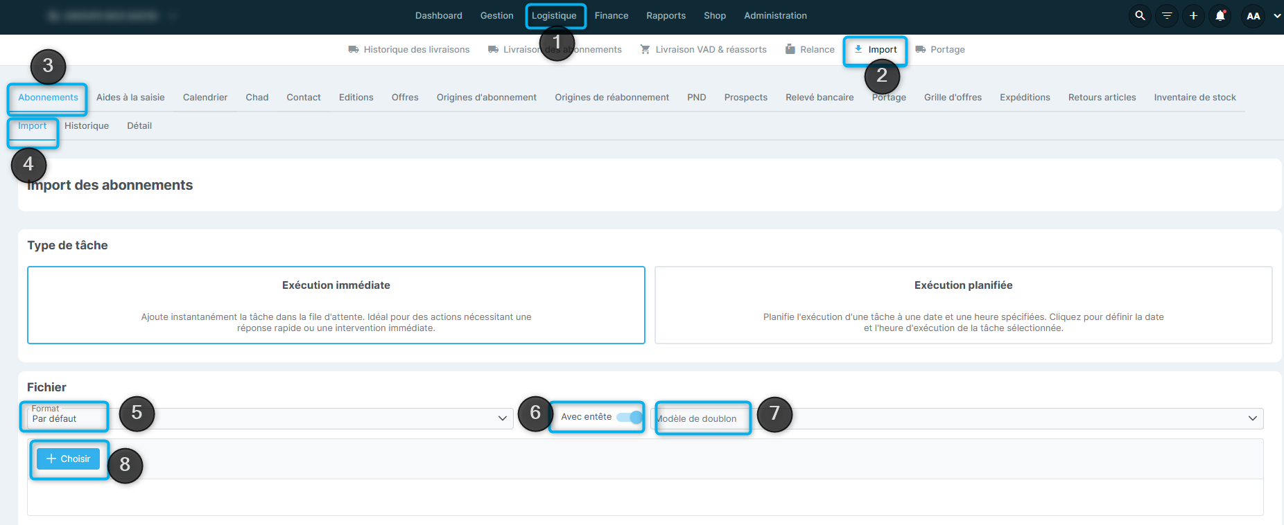 Dans Logistique > Import > Abonnements > Import sélectionnez le type d'exécution (immédiate pour le jour même, planifiée pour une tâche récurrente).